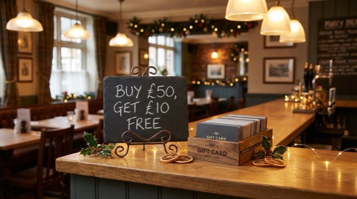 A neighbourhood brasserie might run this during December: "Buy any gift card over £50 and we'll give you a £10 bonus card — valid January to March." That second card fills quiet January tables.