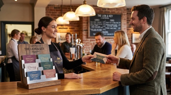 - Table talkers and menu inserts. Add a gift card prompt on your bill folders: "Know someone who'd love this? Gift cards available from £15."